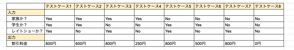 デシジョンテーブルテストでは、このx軸がそのままテストケースになる
