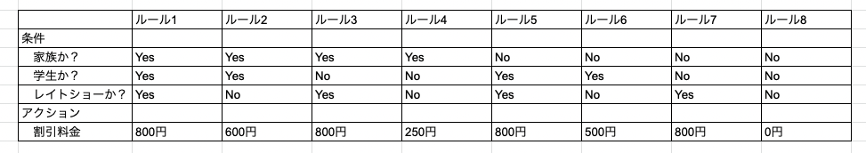 よくみると、レイトショーがYesの場合は、他の条件がなんであれ必ず割引料金が800円になってる…